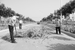 秋收期间,为确保产业集聚区的企业生产不受影响,项城市城管局坚持宣传与治理相结合, 组织人员沿路宣传《道路交通安全法》等法律法规,加大路面巡查力度,对在公路上晒粮的行为早发现、早制止,更好地服务地方经济发展。图为该市城管人员在督促、帮助农户清理道路上的庄稼。