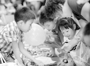 9月21日,一位小摊主(左)在天津的中秋“娃娃集市”上推介自己的商品。当日,中秋“娃娃集市”在天津文化中心彩悦城举行,50余名小朋友带来数千件旧杂志、旧玩具等走进“娃娃集市”低价售卖、物物交换,度过一个有意义的中秋小长假。 新华社发