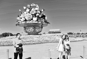 天安门国庆花坛完工 9月25日,游客在天安门广场花坛前合影留念。当日,北京天安门广场国庆中心花坛“祝福祖国”布置完毕,主景观“花果篮”顶高18.2米,篮盘直径达15米。新华社记者 李文 摄