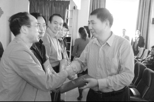 左图为县委书记杨永志为服务淮阳的畜牧专家颁发聘书。