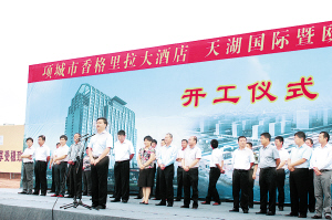 9月23日,项城市香格里拉大酒店、天湖国际、欧蓓莎国际商贸城在城南新区举行开工仪式。项城市委书记黄真伟下达开工令。项城市四大班子领导刘昌宇、韩德平、王玉玲等出席仪式。记者 杨光林 摄