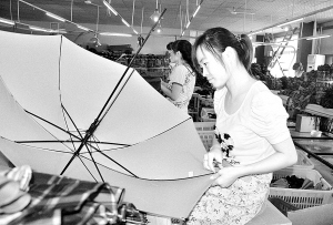 日前,郸城一制伞企业员工在检查成品质量。 近年来,该县充分利用丰富的农副产品和人力资源优势,大力发展农产品精深加工和劳动密集型产业项目,逐步形成了食品医药、生物化工、服装制伞等三大支柱产业,实现产业集群的可持续发展。(记者 沈湛 摄)