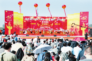 昨日下午,由市委宣传部主办、周口师范学院承办的“盛世国庆 好运周口”大型文艺演出在周口公园城际广场举行。演出现场,演员踏歌起舞,观众尽情喝彩,一起迎接新中国64岁华诞。 (记者 王映 摄)