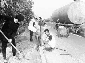 9月30日,在周淮快速通道李集路段,几名工人正忙着做最后的栽道牙工作。周淮快速通道起点为淮阳县城关镇汪洼村,终点为开发区开元大道与省道206平交处,全长19.2公里,按一级公路技术标准建设,双向6车道,路面宽24米,目前该项目已竣工。(记者 侯俊豫 摄)