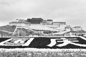 雪域拉萨迎国庆 9月30日,拉萨布达拉宫广场上用旧绢花拼成“国庆”字样。近日,拉萨市园林局从以往用过、没有损坏的绢花中挑选花骨朵完整、色泽靓丽的绢花重复使用,用来装点国庆节日气氛。