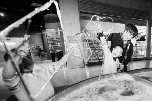 10月7日,小朋友在体验泡泡实验。“十一”长假期间,宁夏科技馆举办“追梦科技、筑梦中国”快乐国庆主题活动,每天分多个时段举办趣味科学实验课、科普秀、机器人表演等丰富多彩的科普体验活动,为国庆期间放假的中小学生献上了一场科技盛宴。