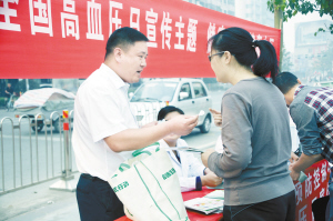 10月8日是我国第18个高血压日,周口巿疾控中心围绕今年的主题“健康心率,健康血压”开展防治高血压科普知识宣传活动,在五一广场设立咨询义诊台,为前来咨询义诊的群众免费测量血压。图为疾控中心工作人员为过往群众介绍相关知识。