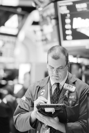 10月7日,一名交易员在美国纽约股票交易所内紧张操作。由于投资者对美国政府出现债务违约的担忧增加,纽约股市三大股指7日下跌报收。截至当天收盘,道琼斯工业平均指数比前一个交易日跌136.34点,收于14936.24点,跌幅为0.90%。标准普尔500种股票指数跌14.38点,收于1676.12点,跌幅为0.85%。纳斯达克综合指数跌37.37点,收于3770.38点,跌幅为0.98%。