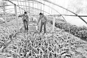 商水县袁老乡刘楼村一蔬菜基地的员工正在采摘成熟的油麦菜。该乡通过引进和培育龙头企业等方式,大力发展无公害蔬菜,全乡无公害蔬菜种植面积已达3000余亩。(刘飞 魏红 摄)