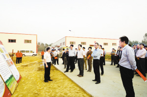 本报讯 (记者 杨光林 文/图) 9月30日,项城市城市组团和新型城镇化发展合力团团长、市委书记黄真伟,项城市产业集聚区和新型工业化发展合力团团长、市长刘昌宇,项城市文化产业发展合力团团长、市政协主席王玉玲一行先后来到六合堂药业项目、康达制药项目、项城港口物流园项目、美华制药项目、10万平方米标准化厂房项目、庄吉服饰项目、金石联科防水材料项目、博奥皮业项目等重点工业项目建设工地,进行实地观摩(如图一)。