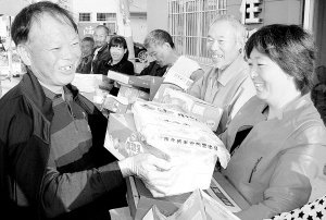商水县“爱心农民工”情系贫困户,传递正能量。日前,平店乡刘营村在外创业成功人士姚辉慷慨捐资2万余元,购买米、面、油等生活用品,对村里生活困难的80多户特困户、计生户、残疾户、老党员、老干部进行了慰问。图为发放礼品的情景。(记者 岳建辉 通讯员 赵永昌 摄)