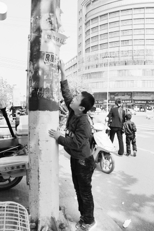 一名放学的小学生受到感染也主动加入到清除城市“牛皮癣”的行动中。