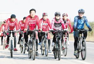10月24日,河北省廊坊市安次区“和谐行”农民单车队的队员们开展环保骑行友谊赛。安次区码头镇后屯村新近组建了一支名为“和谐行”的农民单车队,这支车队由48人组成,车队里年龄最大的53岁,最小的仅有13岁。小小的农民单车队每天早晨都进行骑行活动,他们一路骑行一路宣传环保,成为小有名气的“民间环保宣传队”。(新华社记者 王申 摄)