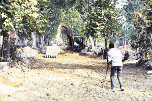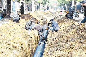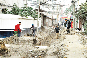 记者在新街支路的改造工程施工现场看到,该路段东西两侧各有一辆工程车正在作业,道路的两层灰土层已经铺好,数十名施工人员正在开挖污水管道。