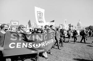 10月26日,在美国首都华盛顿,示威者参加反监控游行。当日,数百名民众在华盛顿参加示威活动,抗议美国家安全局(NSA)针对普通美国民众的大规模监控活动。新华社记者 方喆 摄