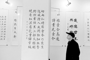 10月27日,一名观众欣赏展出的中小学生书法作品。当日,第二届“兰亭北青杯”北京中小学生书法大赛颁奖会暨获奖作品展在北京市劳动人民文化宫太庙大殿举行。新华社记者 罗晓光 摄