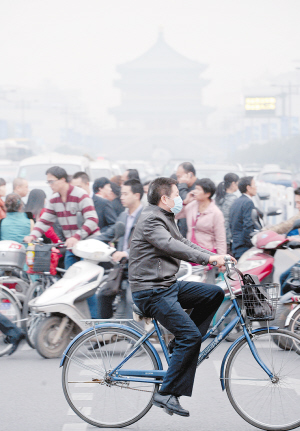 10月28日,西安市钟楼附近,一名戴口罩的市民骑着自行车通过十字路口。10月22日至28日,西安市连续七天空气污染。西安市已于27日启动空气质量应急保障措施,采取检查工地、道路冲洗、监测污染源企业等措施,应对污染。(新华社发)