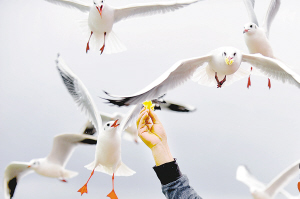 10月28日,几只红嘴鸥从游客的手中啄食。当日,抵达昆明越冬的红嘴鸥在滇池草海上空翩翩起舞,吸引了众多市民与游客前来观赏。每年冬季,成千上万只红嘴鸥都会从遥远的西伯利亚飞抵昆明越冬,成为“春城”昆明的一道美丽风景。(新华社发)