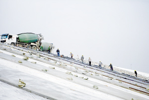 10月27日,施工人员在进行人工衬砌渠道边坡作业。南水北调中线干线汤阴段施工1标位于河南省汤阴县境内,工程长度为9.567千米。目前,工程渠道开挖、渠道换填、大型交叉建筑物建设全部完成,渠道衬砌完成九成,主体工程10月底基本完工。(新华社发)