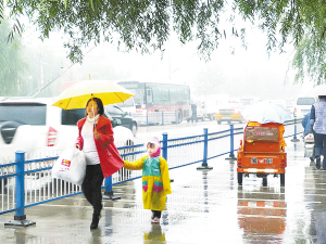昨日,一市民撑着雨伞带着孩子走在中州大道上。从10月29日晚开始,我市出现大范围降雨天气,气温明显下降。此次降水过程对缓解农业旱情和净化空气起到积极作用。( 罗景山 摄)