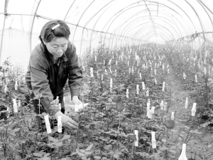 项城市东方办事处积极引导农民搞特色种植,已发展玫瑰种植百余亩,年亩效益4万多元,所产玫瑰畅销郑州、漯河、徐州等地。图为王集村种植户王立荣正在为玫瑰花进行套袋管理。(朱宁宁 摄)