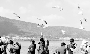 10月30日,游客在昆明滇池草海大坝上观赏红嘴鸥。近日,约3000只来自西伯利亚的红嘴鸥来到云南昆明越冬,“春城赏鸥”季节再次来临。昆明市政府拨款30万元,用于红嘴鸥的投喂与保护。自1985年以来,每年都有大批红嘴鸥飞到昆明越冬,次年3月飞回西伯利亚。昆明市被中国野生动物保护协会授予“中国红嘴鸥之乡”称号。 新华社记者 蔺以光 摄