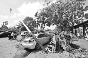 三亚:台风“海燕”破坏严重 三亚河东路路边的一辆汽车被大风吹倒的电线杆和树木压住(11月11日摄)。11月10日下午至11日凌晨,受台风“海燕”(强台风级)影响,海南三亚市区许多树木、广告牌被狂风吹倒,一些路段积水严重,给市民和游客的出行带来不便。新华社记者 郭程 摄
