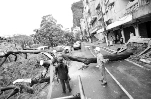 11月11日,在越南东北部广宁省下龙市,环卫工人在清理街道上被刮倒的树。 新华社发