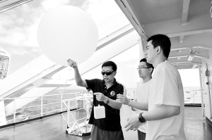 在“雪龙”号释放探空气球 11月11日,中国第30次南极科学考察队大洋考察队队长矫玉田(左)和考察队员郭延良(中)、韩晓鹏(右)在给第二个探空气球挂上探空仪发射机。当日,中国第30次南极科学考察队大洋考察队在“雪龙”号上释放探空气球,以探测大气剖面的温度、湿度、气压等要素,这项科学研究将在“雪龙”号航行过程中连续进行。新华社记者 张建松 摄