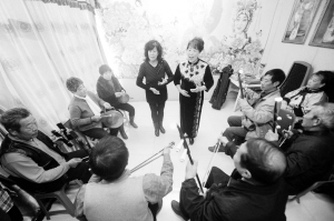 11月12日,戏迷俱乐部成员在谭庄村的戏迷活动室表演评剧《花为媒》。