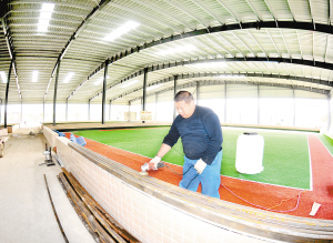 昨日,一名工人在即将竣工的市体育中心老年人体育健身基地做扫尾施工。近年来,市体育局建立老年人活动基地、老年人健身基地和老年人健身活动室,组织开展老年人健身活动,并在市体育中心建设了6个标准化门球场,吸引老年人来此健身。(记者 沈湛 摄)