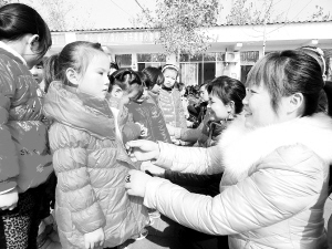 昨日,商水县舒庄乡几名“爱心妈妈”正在为乡中心幼儿园的留守儿童换新棉衣。当日,该乡组织6名“爱心妈妈”来到该幼儿园开展送温暖活动,为孩子们送去20件新棉衣和一些文具。(乔连军 摄)
