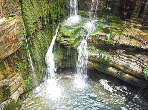 云台山瀑布位于云台山风景区老潭沟的尽端,沿老潭沟上行400米,就可以看到。瀑布上端如同朵朵白云,又如团团棉絮,悠悠飘落,连绵不绝;下端宛如飞花溅玉,纷纷扬扬,洒入墨绿色的水潭。急泻而下的瀑布,在水潭中溅起1米多高的水花,又化成一团水雾,把瀑布罩在蒙蒙的雾中。