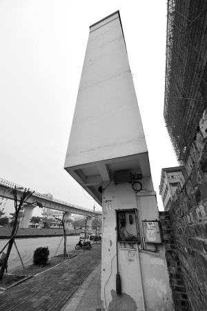 南宁有幢“楼薄薄” 记者在广西南宁市望州路上拍摄的“超薄住宅楼”(11月21日摄)。四五层高的楼房,却只有两米左右的宽度,看起来岌岌可危的楼房甚至临街而建……