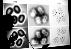 11月22日,国家纳米科学中心研究员裘晓辉博士在介绍他们直接观察到的氢键(上图)。当日,记者从中国科学院国家纳米科学中心获悉,通过利用改进的非接触原子力显微镜,中国科学家近日在世界上首次得到了分子间氢键的实空间图像。这为科学家理解氢键的本质,进而改变化学反应和分子聚集体的结构奠定了基础。