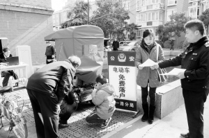 昨日,周口市公安局七一路公安分局的民警利用双休日在居民小区内为市民电动车进行实名登记打码。据介绍,七一路公安分局自开展电动车实名登记服务以来,已统计打码电动车两万多辆,有效遏制了盗窃电动车案件发生。记者 王映 摄