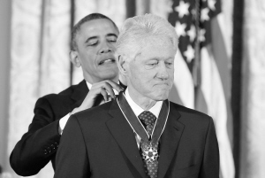 授勋 11月20日,美国总统奥巴马(后)在华盛顿白宫为前总统比尔·克林顿佩戴“总统自由勋章”。“总统自由勋章”是美国最高平民荣誉。