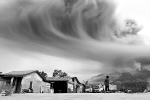 火山喷发 11月18日,在印度尼西亚北苏门答腊省卡罗地区的一个村庄,一名女士远眺锡纳朋火山喷发。 当日,印度尼西亚一火山喷发,烟尘飘至2.5万米高空。