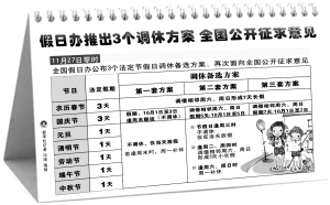 据新华社长春11月27日电(记者 刘硕)27日,全国假日办在新华网等网站公布了三套法定节假日调休安排方案,并公开向群众征求意见,这已经是全国假日办第二次就节假日调休方案公开征求意见。此前全国假日办发布相关调查问卷时曾引起各界群众热情参与,然而此次方案“三选一”的方式却让人略感无奈。
