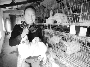 商水县舒庄乡乔庄村“养兔王”喜英谈投资50万元发展獭兔走上了致富路,并带动当地20户群众养兔致富。图为喜英谈和她的獭兔。(乔连军 摄)