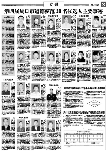 3.参与网络投票的,登陆中华龙都网(www.zhld.com)、周口新网(www.zkxww.com)“第四届周口市道德模范评选”专栏进行投票,每个I P地址限投一次。