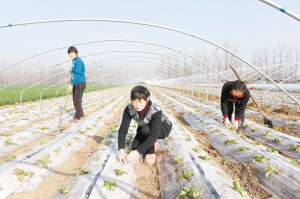 昨日,商水县城关乡大刘村村民在管理莴笋苗。冬闲时节,该县积极引导农民种植大棚蔬菜,让农民通过种植反季节蔬菜发家致富。(刘飞 魏红 摄)