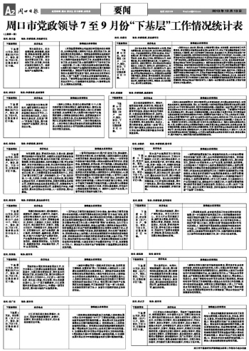 周口市党政领导7至9月份“下基层”工作情况统计表