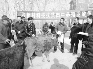 项城市检察院和市农办为帮助扶贫村的农民脱贫致富,为贾岭镇张新行政村30户农民发放母牛30头,并帮助其他贫困户“滚动”发展,带动更多的贫困家庭过上更加幸福的生活。图为母牛发放仪式现场。(张永久 赵振江 摄)