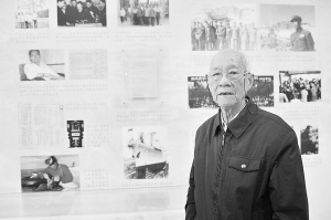 12月15日,中国科学院院士郁铭芳在展出的他的论文手稿旁留影。当日,我国首个以科学家群体为主题的大型展览“科技梦·中国梦——中国现代科学家主题展”在北京国家博物馆开幕。 新华社记者 孙瑞博 摄