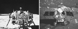 12月15日晚,正在月球上开展科学探测工作的嫦娥三号着陆器和巡视器进行互成像实验,“两器”顺利互拍,嫦娥三号任务取得圆满成功。未来几天,在进行科学探测的同时,“玉兔”号月球车还将绕陆器继续行驶,从不同角度与着陆器多次互拍。这是北京飞控中心大屏幕上显示的嫦娥三号着陆器、巡视器互拍成像(拼版照片)。 新华社记者 丁林 摄