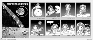 镜头:在虹湾地区布满砾石和尘埃的灰黑色月面上,着陆器被阳光照得一片金色,月球车“胸前”的五星红旗鲜艳夺目——着陆器和月球车用各自携带的相机互相拍照,照片数据完整、图像清晰。