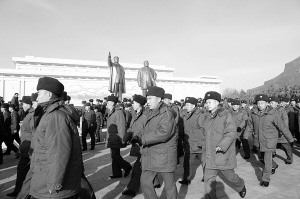 12月16日,朝鲜人民军军人在平壤市中心万寿台金日成、金正日铜像前参加纪念活动。12月17日是朝鲜前最高领导人金正日逝世两周年纪念日。连日来,平壤各界群众纷纷来到市中心万寿台的金日成、金正日铜像前悼念。 新华社记者 张利 摄