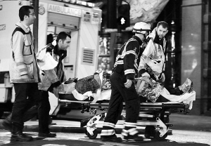 12月19日,在英国伦敦阿波罗剧院,救援人员在现场运送受伤者。当晚,伦敦市中心阿波罗剧院屋顶坍塌,当时剧院内坐满了看戏的观众。事故导致88人受伤,至少7人伤势严重。
