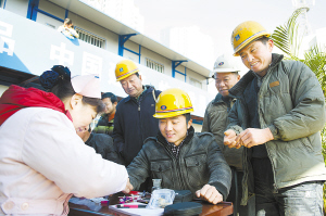 12月27日,社区志愿者在为农民工建设者进行健康体检。当日,安徽省合肥市大通路街道华业社区组织社区志愿者来到辖区建筑工地开展“暖情暖冬日 健康享和谐”关爱农民工建设者志愿服务活动。活动中,社区志愿者为农民工建设者进行免费的健康体检,并为他们送上御寒的围巾、手套以及各种日常生活用品,在寒冷的冬日里为农民工兄弟送去一份温暖。 ( 新华社记者 杜宇 摄)